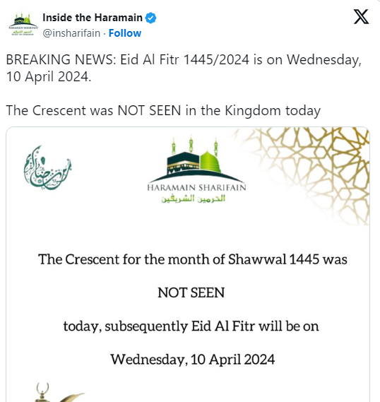 BREAKING NEWS: Eid Al Fitr 1445/2024 is on Wednesday, 10 April 2024.
